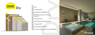 Το σύστημα MARMOLINE MONOSIS DRY προσφέρει κορυφαία διαπνοή και παράλληλα παρέχει άριστη θερμομόνωση, και την χωρίς συμβιβασμούς μακροχρόνια αντοχή και αισθητική ευελιξία υφών και αποχρώσεων στα υλικά τελικής επικάλυψης.